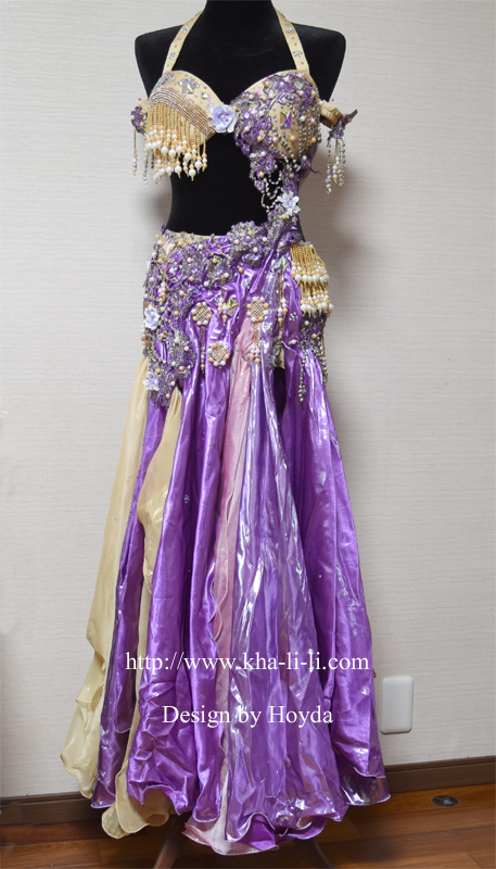 特長:光沢あるサテンラベンダーにゴールドを配した軽めの衣装です。